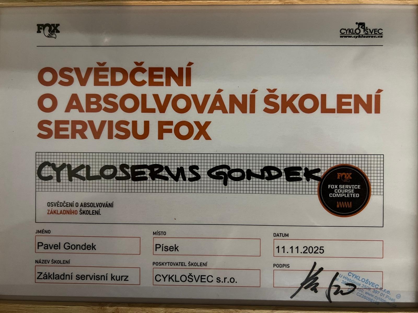 Úspěšně jsem absolvoval školení Fox (odpružené vidlice a tlumiče)